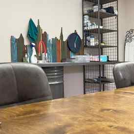 Студия «Гримёрка» оформлена в стиле лофт, с использованием натурального дерева, кирпичных стен и металлических элементов, что придаёт интерьеру уютную и творческую атмосферу. Здесь каждый может расслабиться, почувствовать себя как дома и насладиться эстетикой пространства. Для удобства гостей предусмотрены уголок для отдыха с чаем и кофе, бесплатный Wi-Fi и возможность приобрести профессиональную косметику.